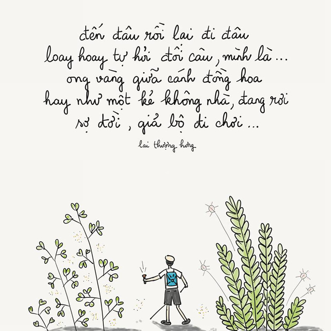Giữa một màu u ám ấy, những vần thơ siêu đáng yêu cùng những bức vẽ "hoa lá cành" phụ họa ngộ nghĩnh của anh chàng Lai Thượng Hưng (SN 1989, content writer, TP.HCM) tựa như ánh nắng tràn trề sinh lực sống.